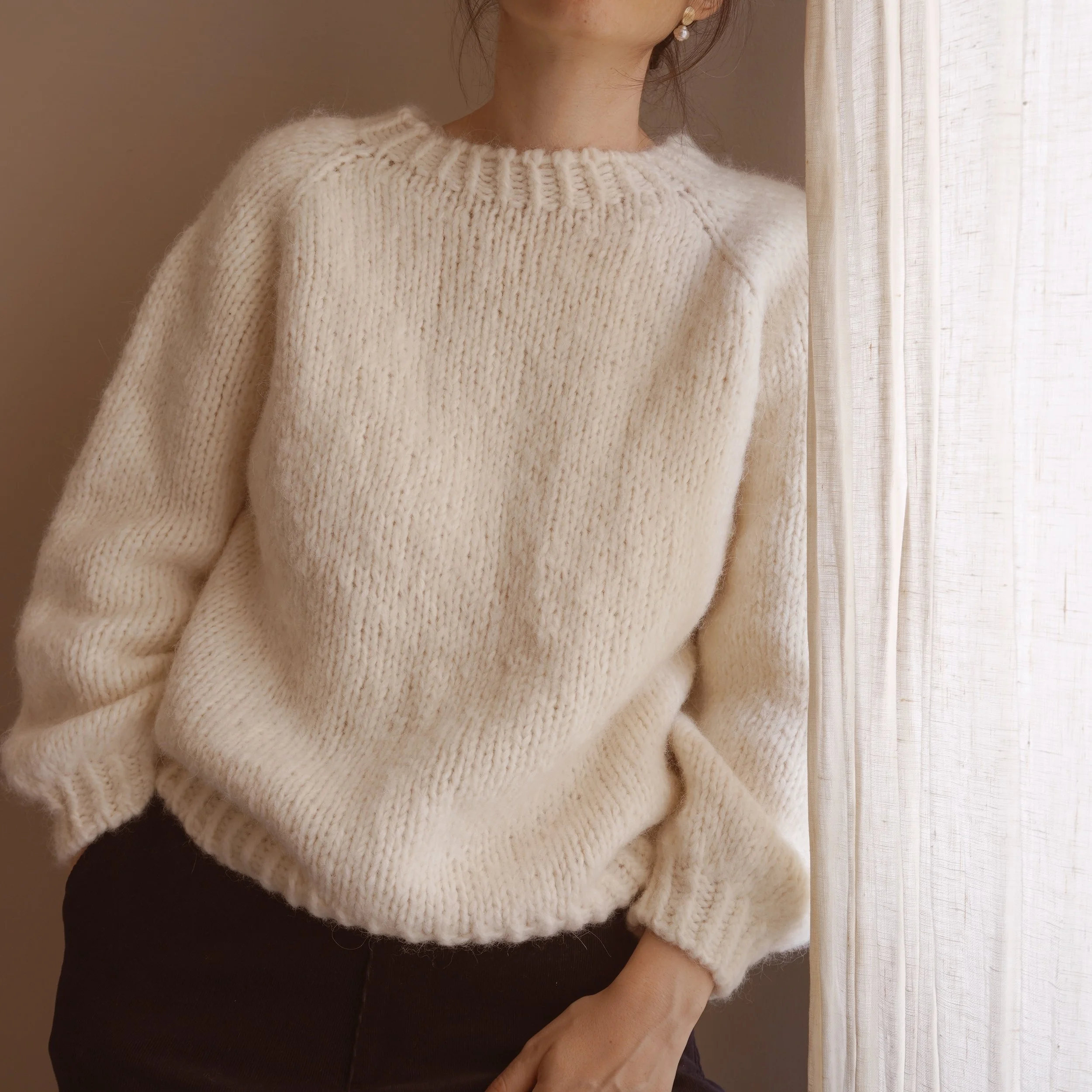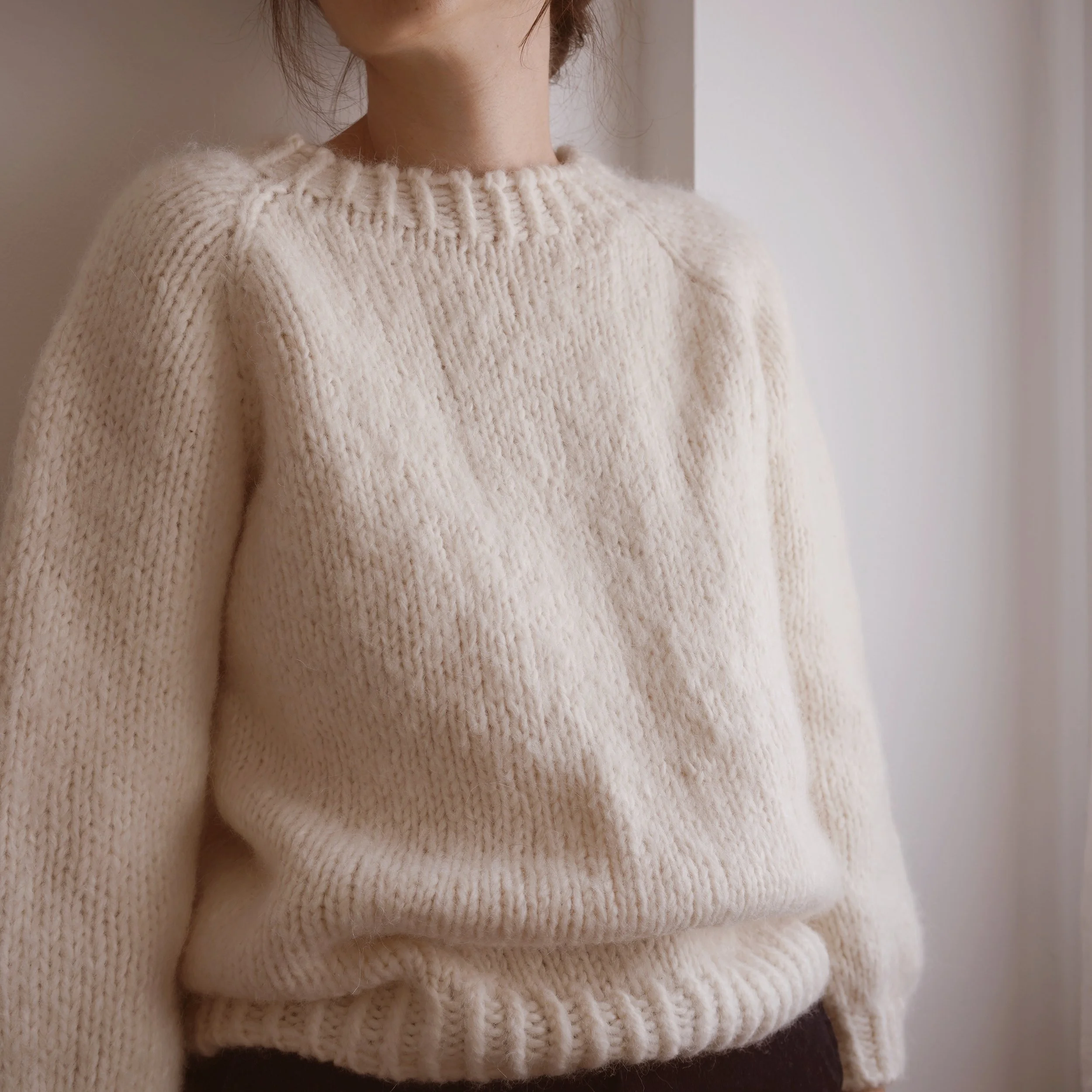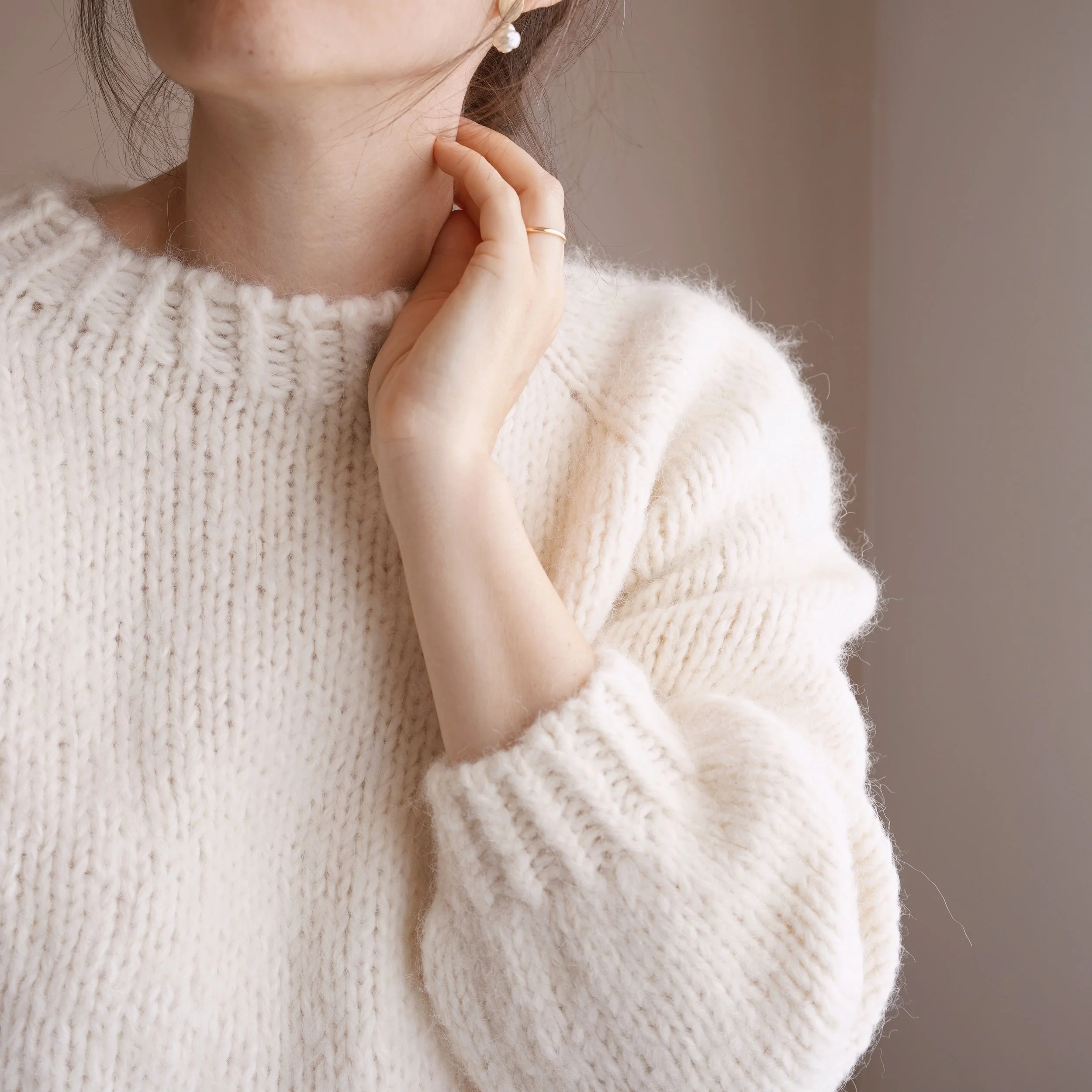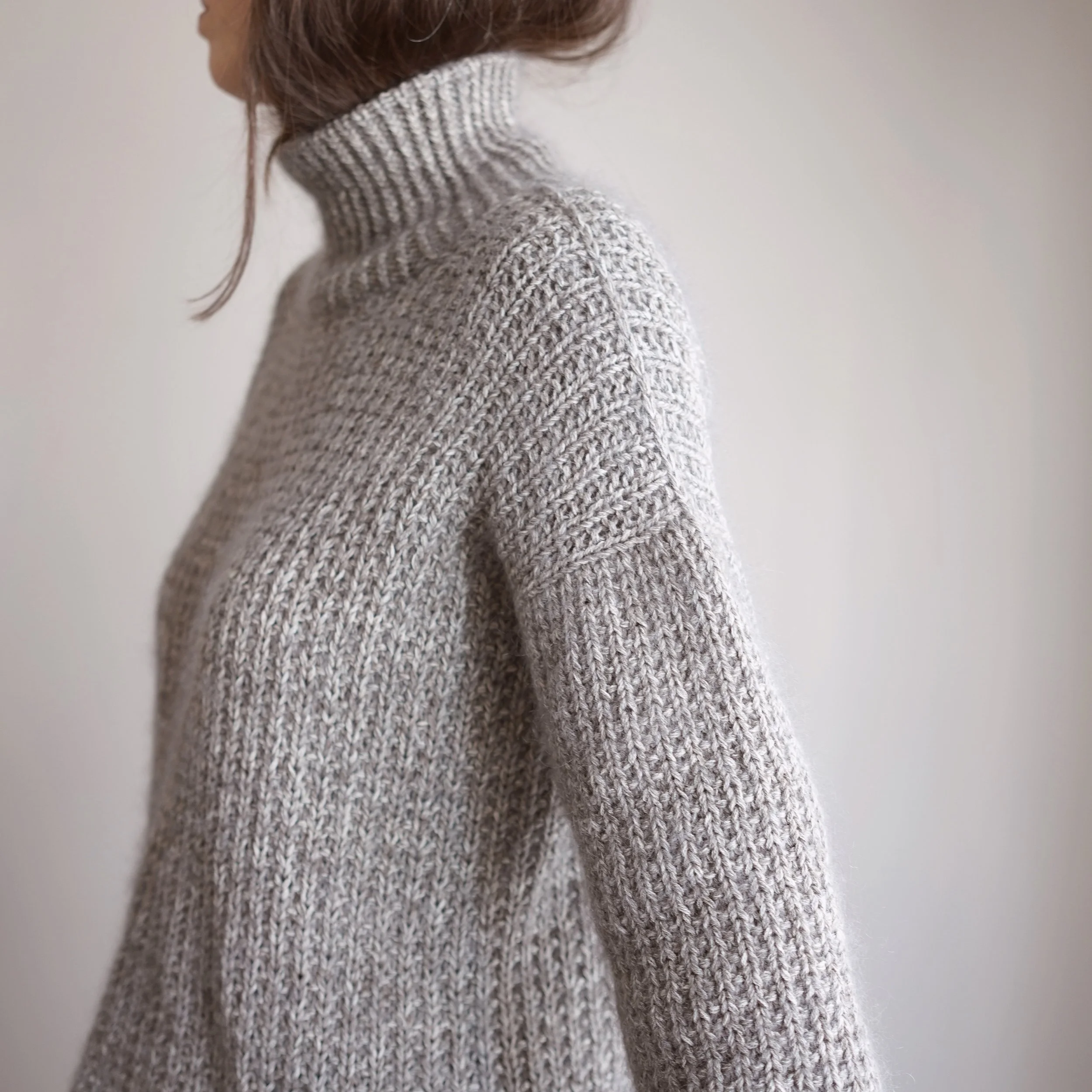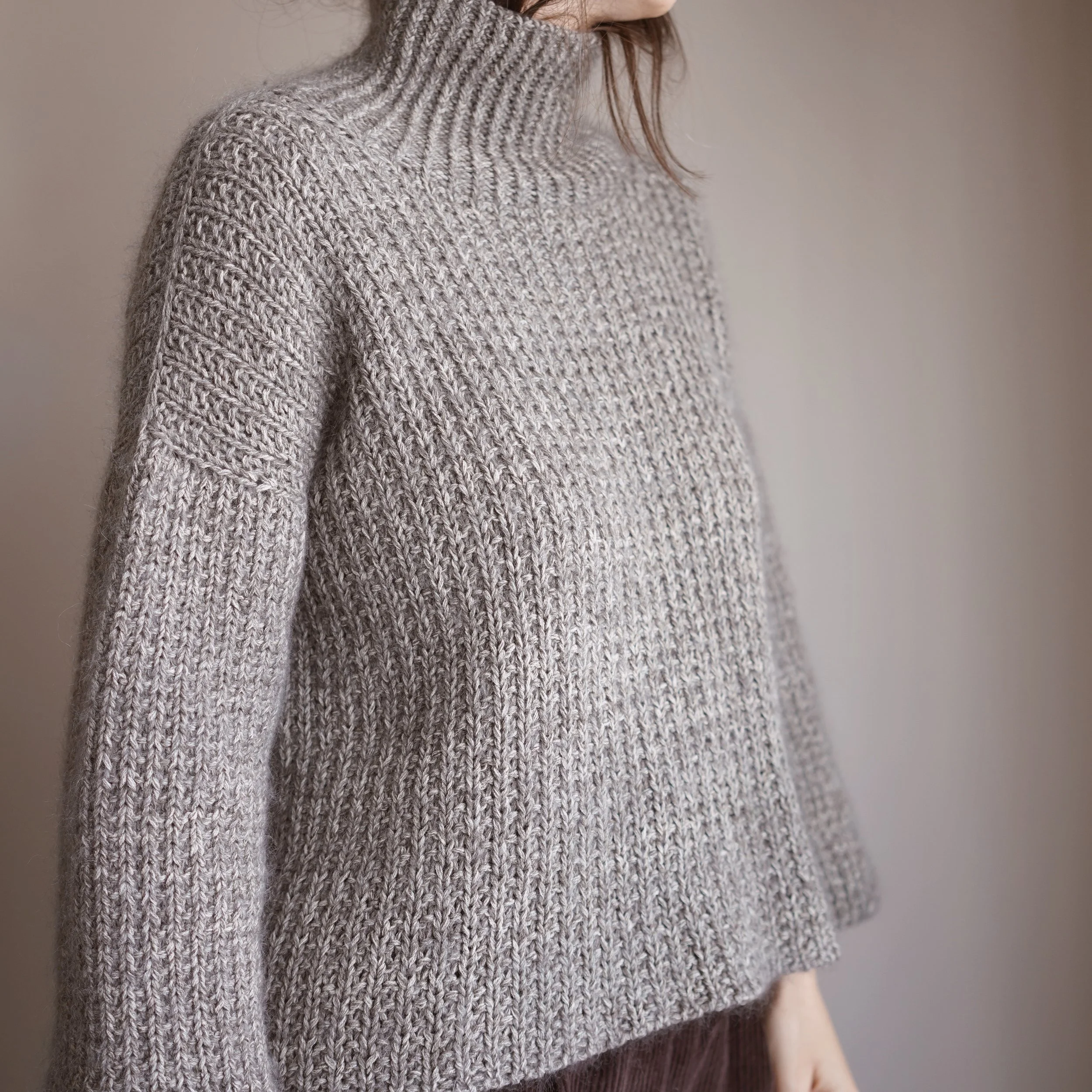 A classic V-neck sweater whose understated elegance makes it easy to wear, while still looking incredibly unique thanks to its minimal and fine construction elements. It has dropped shoulders and an oversized fit. The sweater is worked from top to bottom. The shoulders are created using short rows to provide a more comfortable fit. First, the back is worked flat, with some increases to shape the armhole. The front is then worked with increases to form the V-neck.